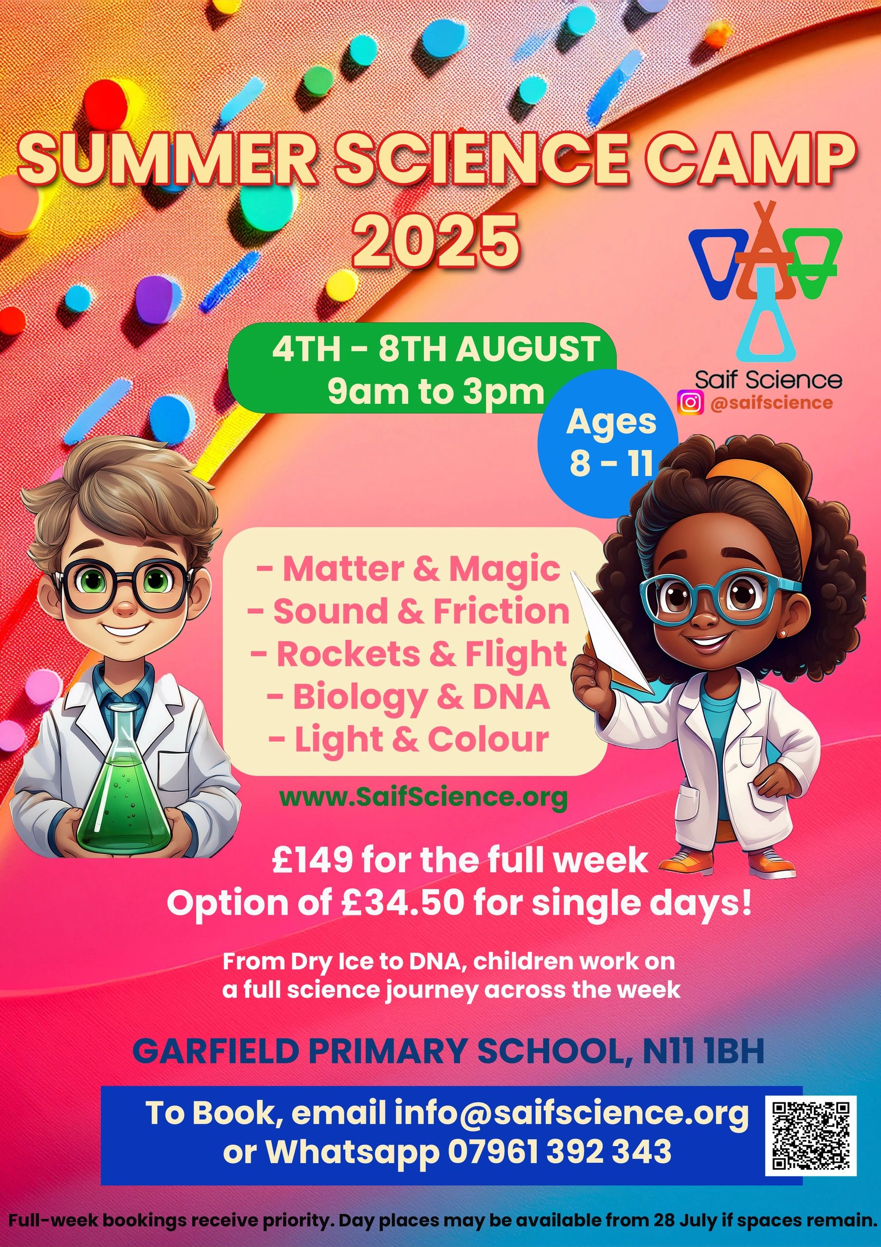 Get ready for a week full of adventure, fun, and making memories at Saif Science Holiday Camp. Starting with 5 days in the Summer Holidays at Garfield School, London N11, we are welcoming 8 - 11 year olds to experience science demonstrations, hands on activities, games and more!